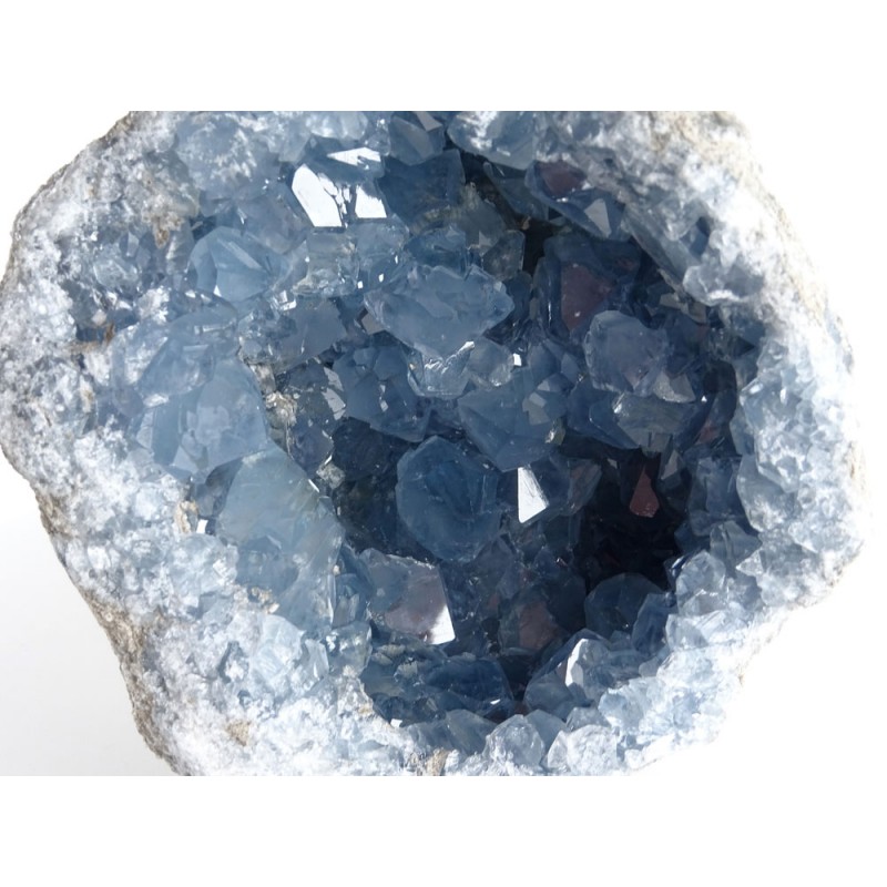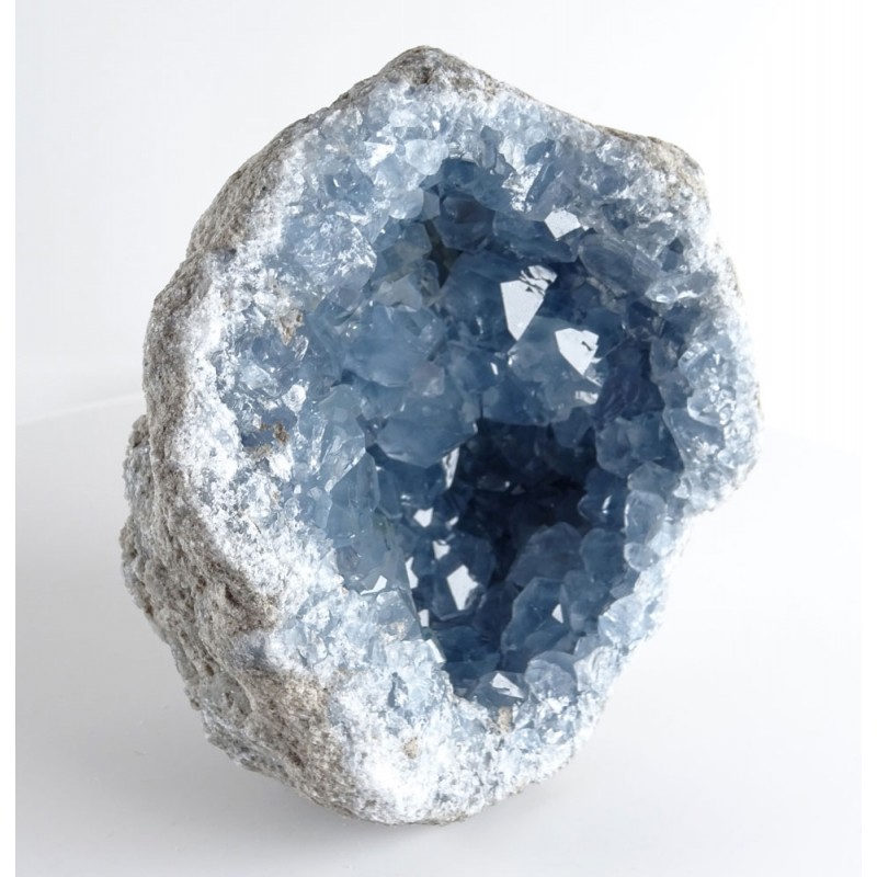 Top grade Collector specimen. Natural thin crust rough Celestite open geode, with beautiful well preserved mixed sizes semi translucent.