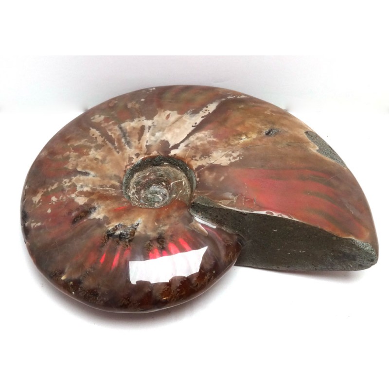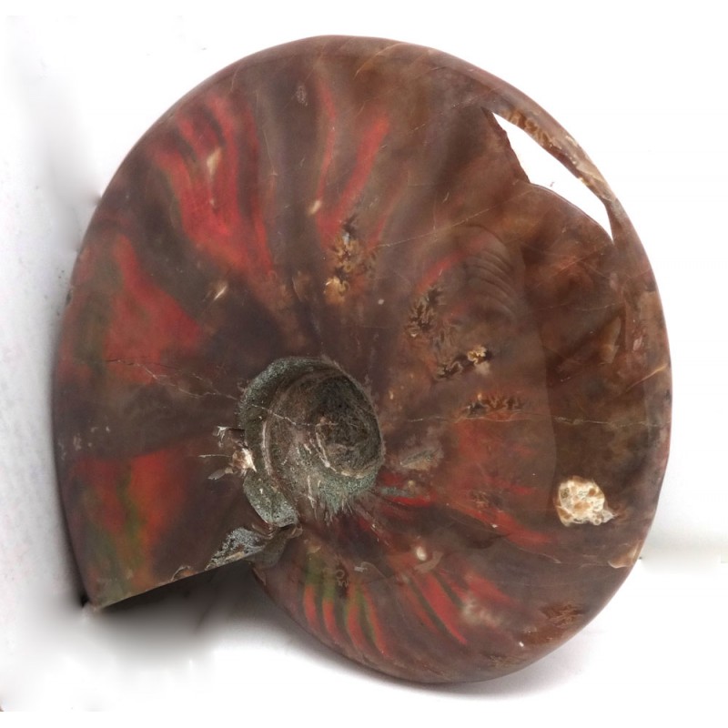 Strong red iridescense both sides of this complete ammonite polished fossil, also a rarer purple tone.