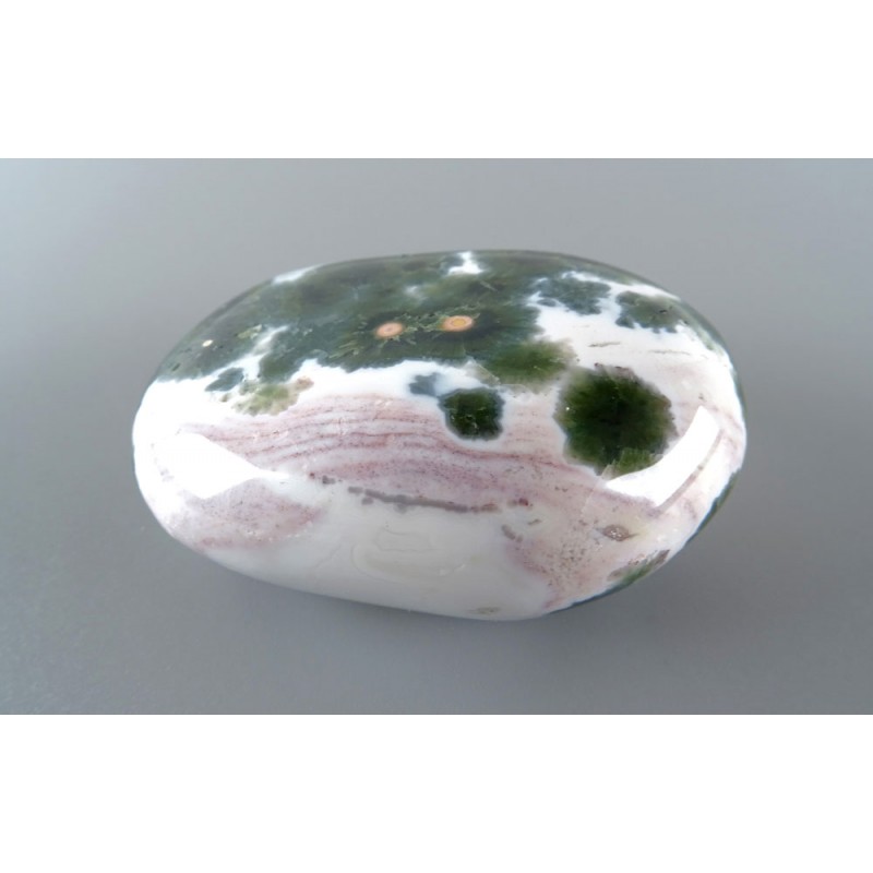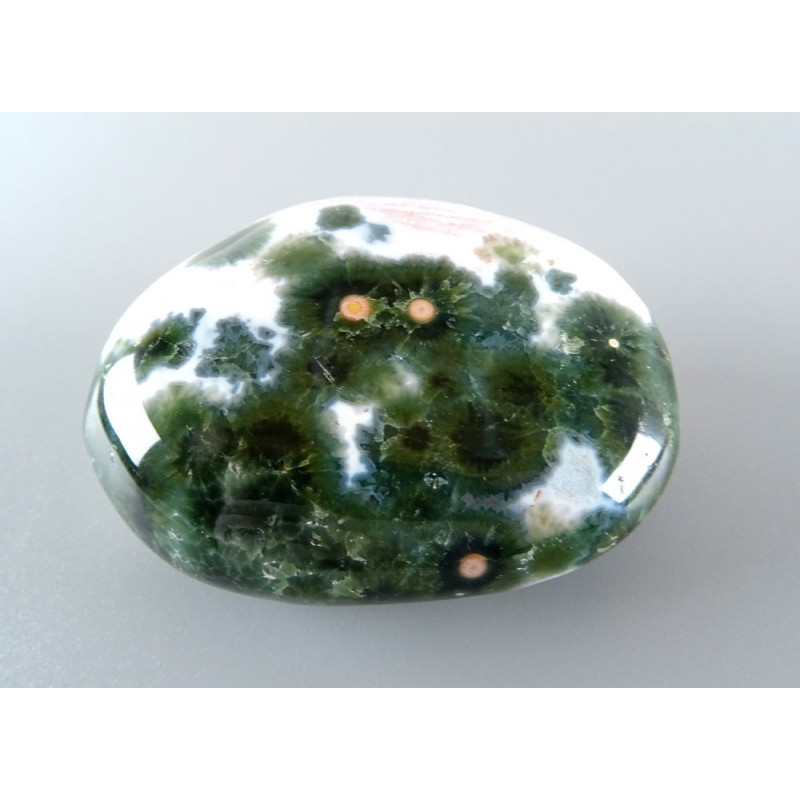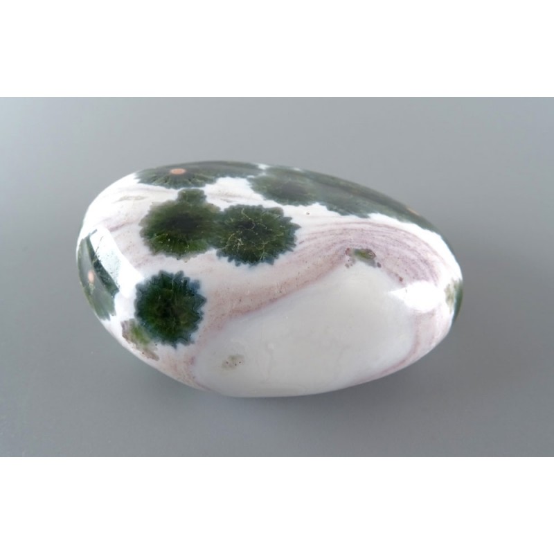 A beautiful Ocean Jasper ivory cream pink contrasting with strong green colours, handcrafted into a tactile palm size pebble.