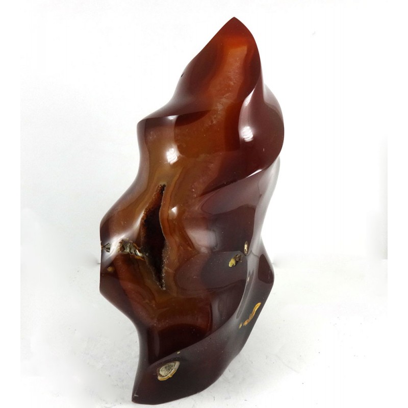 Size: H = 14.2 cm W = 9.5 cm D = 5.3 cm Top quality deep red brown carnelian carved into a ""Twist"" sculpture. crystal geode opening on one edge, various white or lighter spots on the surface some with an opening some not, From Madagascar.