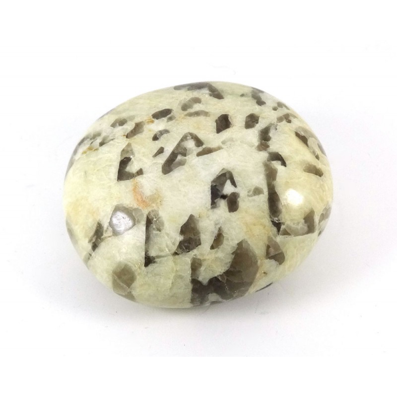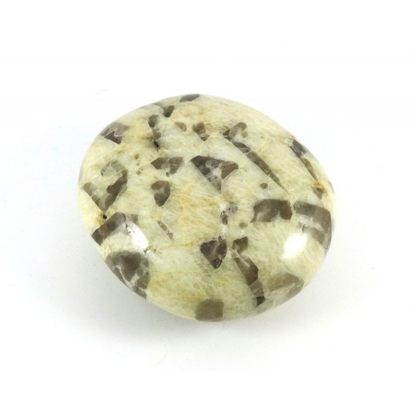 Size: L = 6.2 cm W = 5.4 cm D 3.3 cm. classic colours with this unique mineral combination, feldspar colour with contrasting smokey quartz. From Madagascar.