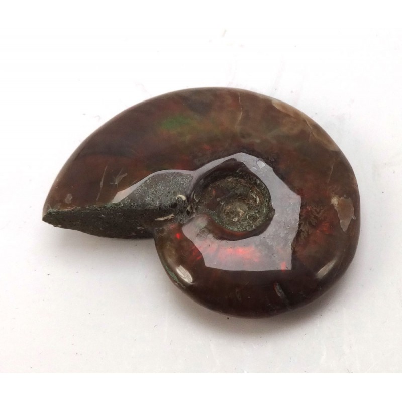 Strong red iridescense both sides of this complete ammonite polished fossil.