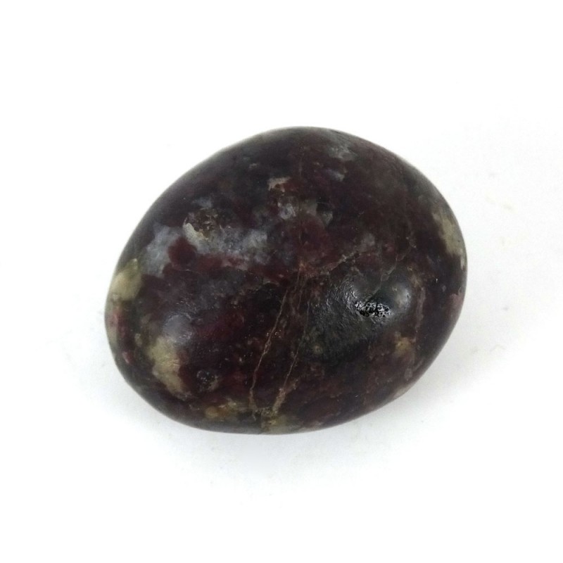 Nice deep red colour rubellite tourmaline in feldspar, great contrasting colours of white red and smokey, hand polished into a pebble shape, material from Madagascar.