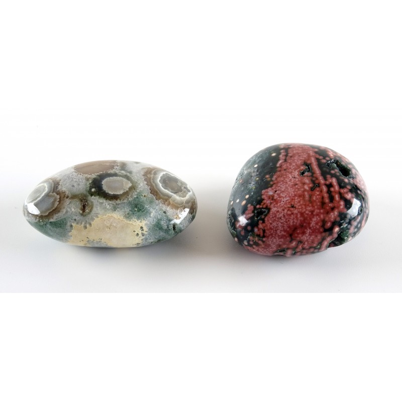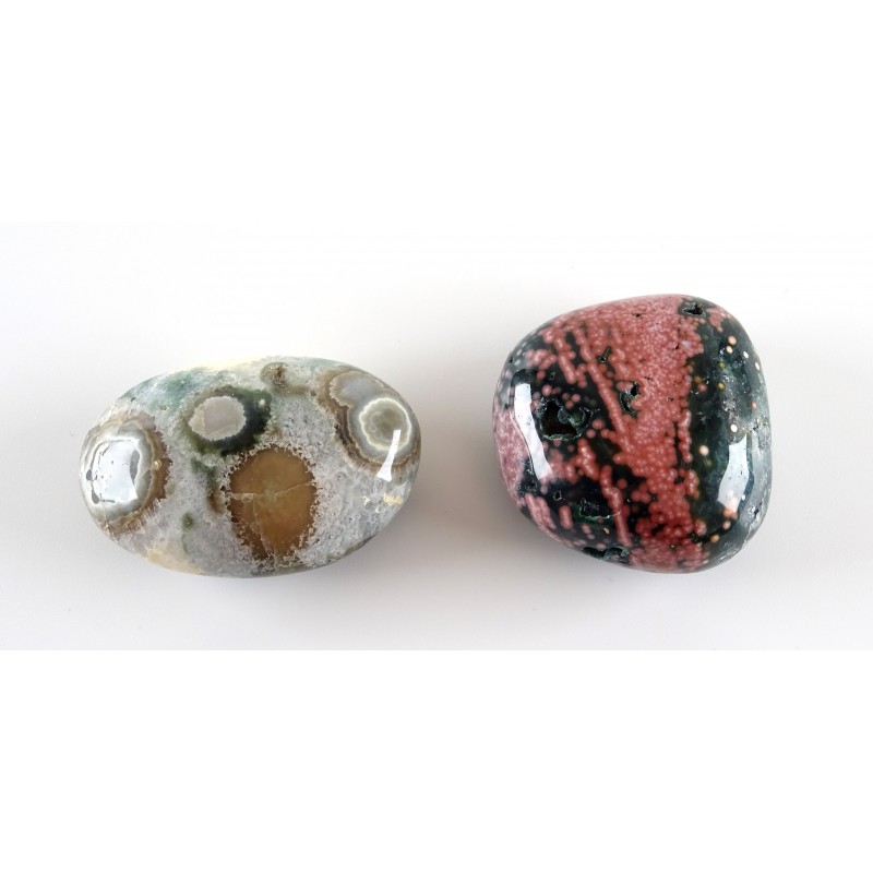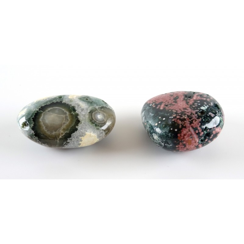 SET of 2 Beautiful contrasting hand crafted Ocean Jasper Pebbles. One with deep pink coloured Micro Orbs and dotted with small natural velvety geodes and the second pebble is semi translucent with large Orbs formation.