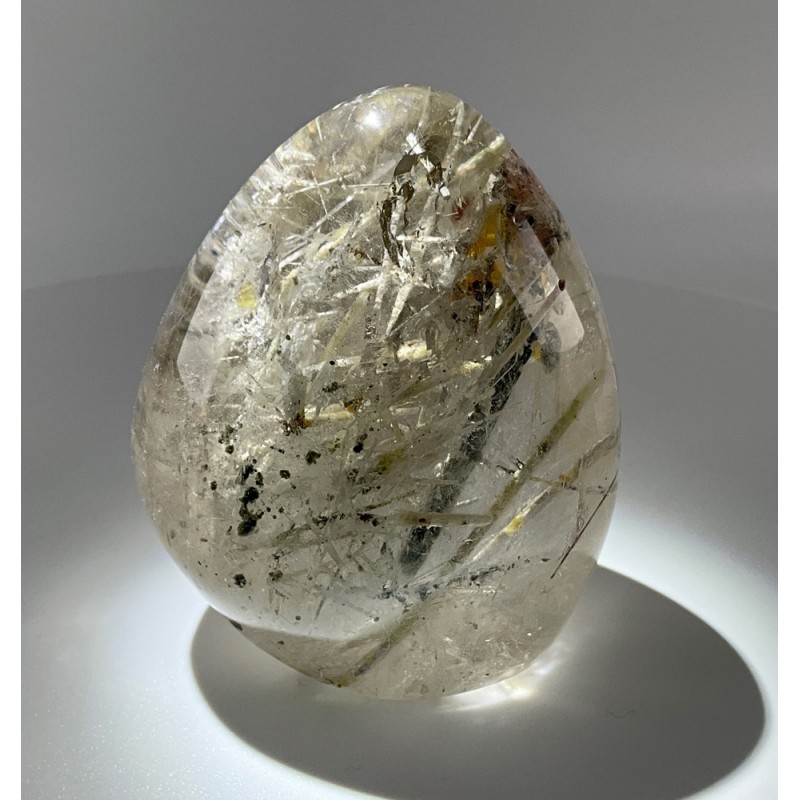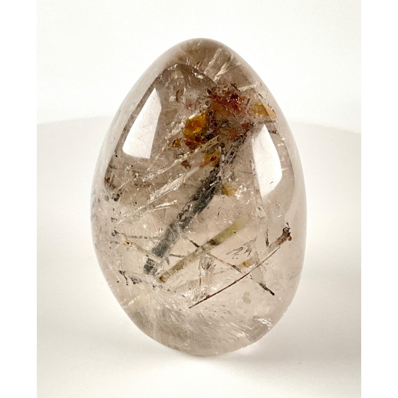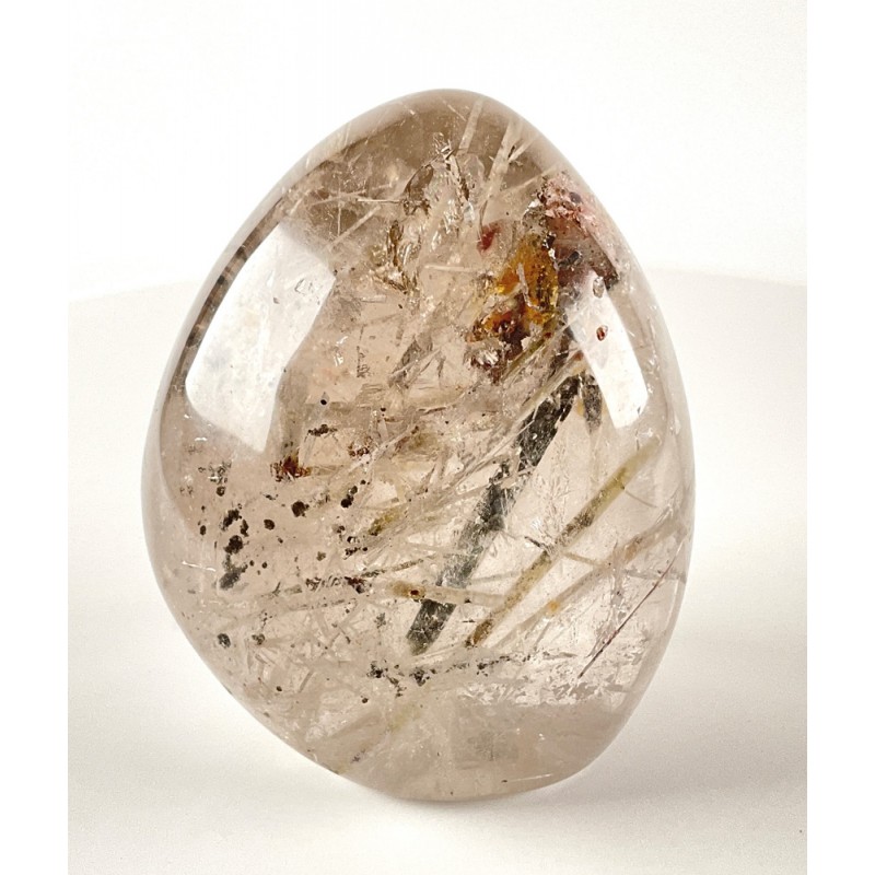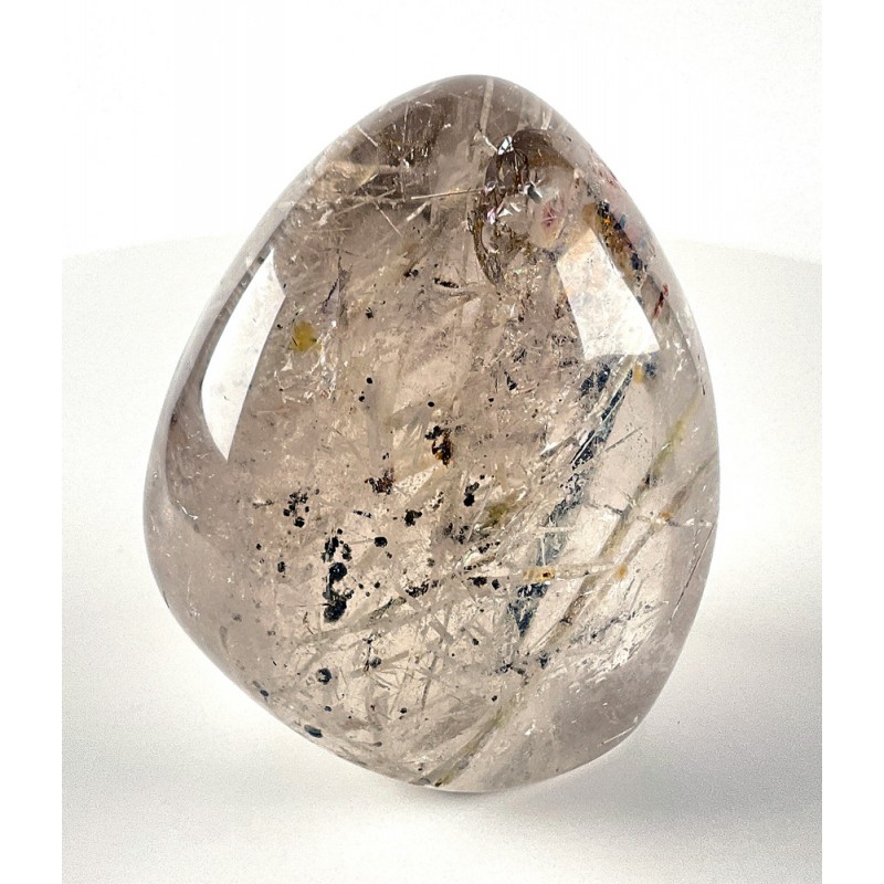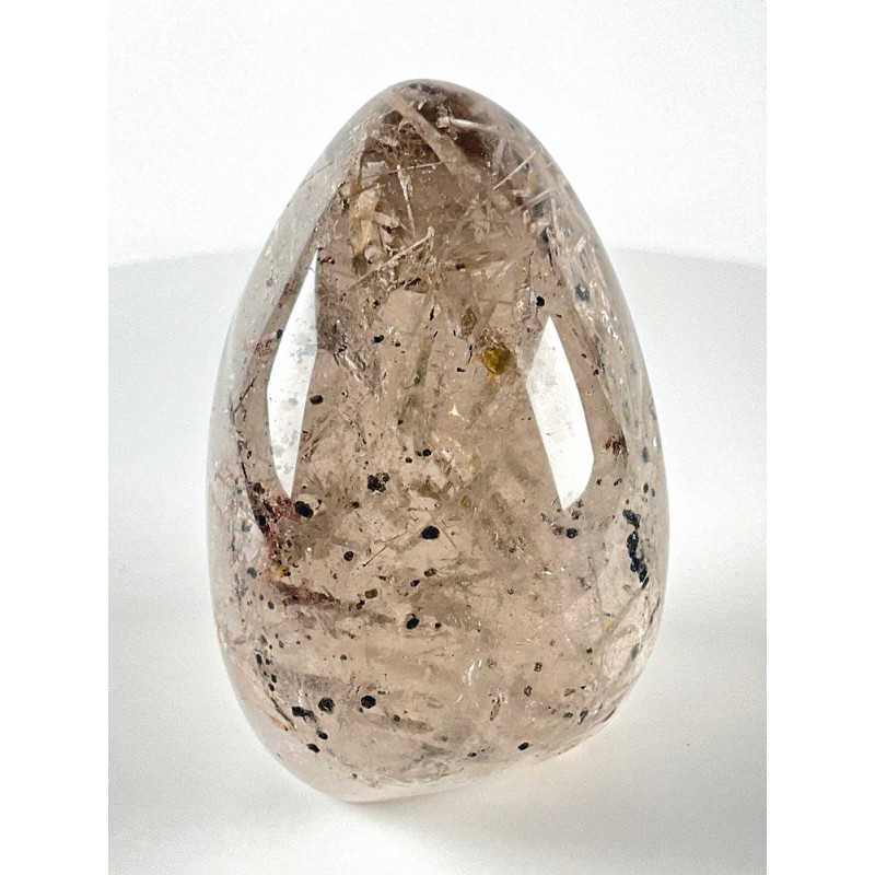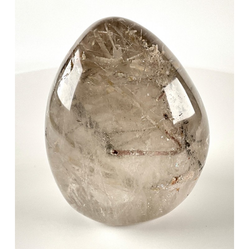 Top grade pale Smoky crystal filled with hollow needles of Hematite Iron, flakes of Mica and small sparkly flashes of rainbows, hand crafted into a beautiful all polished tactle Dome like standing display piece. A true collector specimen, from Madagascar.