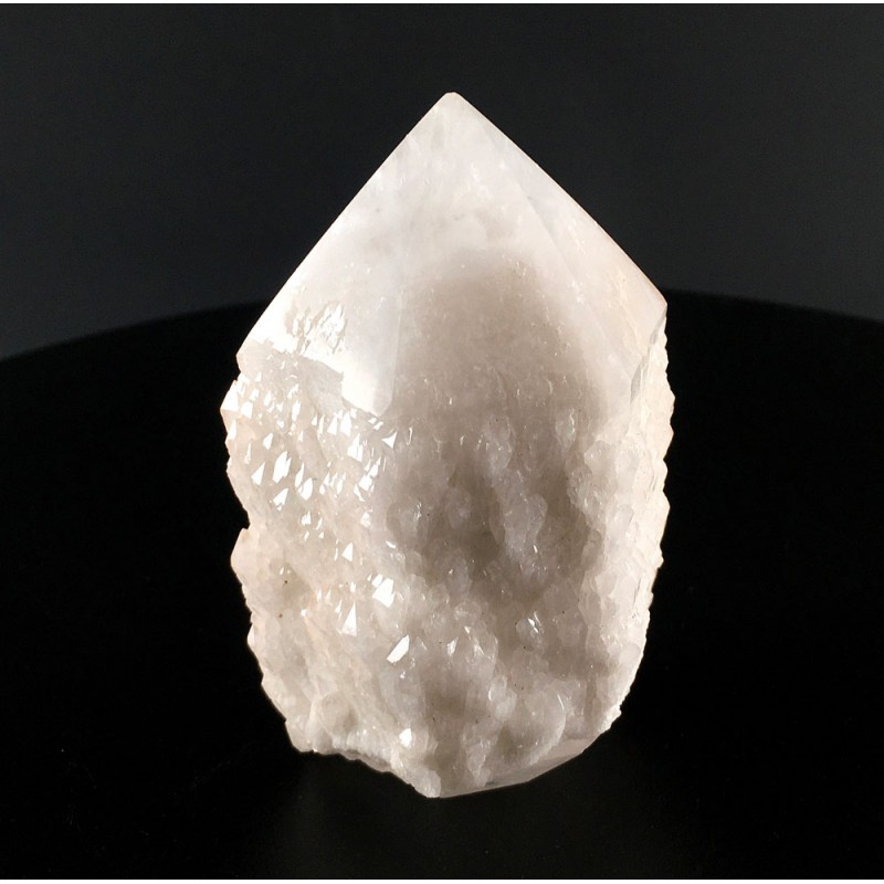 Sublime Candle QZ. with a polished Tip and cut base standing Prism, belted with natural rough sparkly pink hue Cathedral like formation of smaller crystals.